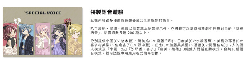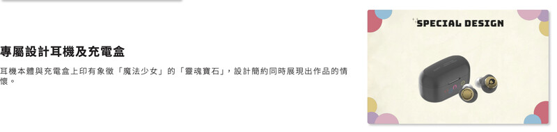 耳機及充電盒印上象徵「魔法少女」的「靈魂寶石」,設計簡約卻充滿作品情懷,外盒插圖描繪小圓們戴著耳機外出的姿態,收藏感滿分!
